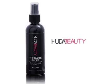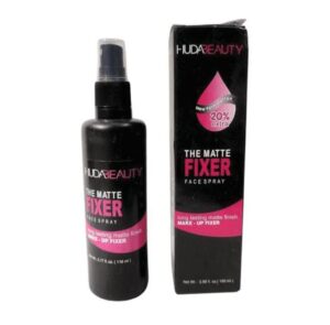 This image shows a black bottle and its packaging box for a product called “MAC The Matte Fixer Face Spray.” The product is described as providing a “long lasting matte finish” and is labeled as a “MAKE-UP FIXER.” The bottle has a spray nozzle, indicating it is used as a mist or spray. The net…