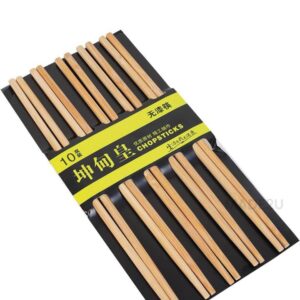 The image shows a pair of bamboo chopsticks. Description: Material: Natural bamboo, giving a smooth, light wood finish. Shape: Long and slender with a rounded tip at one end and a slightly thicker blunt end at the other. Design: Simple and minimalist, with no additional carvings, patterns, or colors. Common Uses: Eating utensils commonly used…