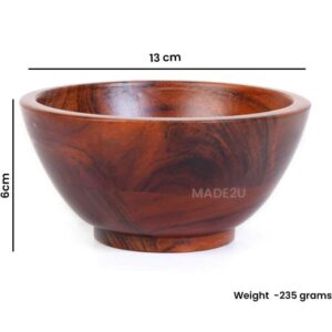 The image shows a wooden bowl with the following specifications clearly marked: Diameter (Top Opening): 13 cm Height: 6 cm Weight: 235 grams Material: Appears to be polished wood (likely handcrafted) The bowl has a smooth, glossy finish with visible natural wood grain patterns, giving it a rich and elegant appearance. It’s likely used for…