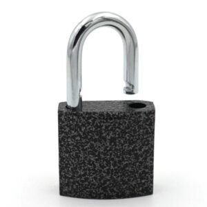 The image displays a padlock and a set of keys. This type of lock is commonly used for securing: Doors and gates Storage units and lockers Bicycles and chains Chests and toolboxes The padlock has a metal body with a textured, possibly hammered, finish and a shiny brass-colored plate with an emblem on the front….