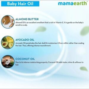 The image shows a bottle of Mamaearth Nourishing Hair Oil for Babies. Here’s a detailed description based on the visible text and imagery: Product Name: Mamaearth Nourishing Hair Oil for Babies Key Features: Ingredients: Contains Almond & Avocado Oil No Mineral Oil MadeSafe Certified Dermatologically Tested Suitable for Ages: 0–10 years Net Volume: 100 ml…