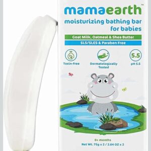 The image shows a package of Mamaearth Moisturizing Bathing Bar for Babies. Here’s a detailed description: Product Name: Mamaearth Moisturizing Bathing Bar for Babies Key Ingredients: Goat Milk Oatmeal Shea Butter Free From: SLS/SLES Parabens Toxins Features: Toxin-Free Dermatologically Tested Maintains pH 5.5 Suitable for Babies Aged 0+ Months Packaging Details: This is a Value…