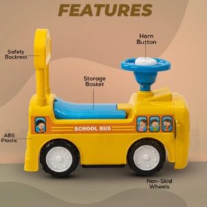 The item pictured is a yellow ride-on school bus toy for toddlers and young children. It appears to be a foot-to-floor style ride-on, as it doesn’t have pedals, and is typically propelled by the child’s feet. Key features visible in the image include: A steering wheel for direction. A high backrest/push handle on the back, which can be used by parents…