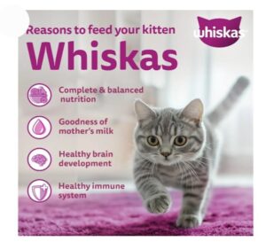 The image shows a 1.2 kg pack of Whiskas™ Adult Cat Food in Ocean Fish Flavour. 🐱 Product Name: Whiskas™ Adult – Ocean Fish Flavour 📦 Packaging Overview: Brand: Whiskas™ Target Age Group: Adult cats 1+ years Flavor: Ocean Fish Net Weight: 1.2 kg Feeding Duration: 61 days (approx.)(based on average serving size for an…