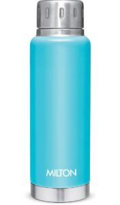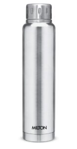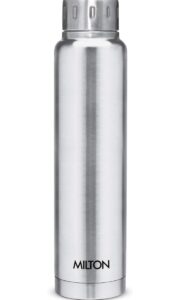 The image shows a sleek, stainless steel water bottle from the brand Milton, placed on a white desk or tabletop in a modern, minimalistic setting. Key Features of the Bottle: Material: Stainless steel, likely insulated. Color: Metallic silver with a polished finish. Brand: “MILTON” is printed near the bottom. Lid: Screw-on cap, also made of…
