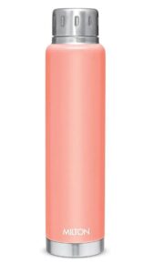The flask itself is made of stainless steel with a brushed finish, giving it a sleek, metallic look . It has a tall, slender, cylindrical body and a small black line near the neck. The brand name “MILTON” is visible in embossed letters at the bottom of the flask. The flask also has a double-walled…