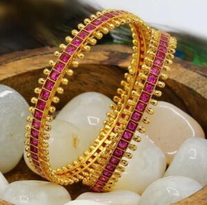 Stone Setting: The central feature of the bangle is a continuous line of brightly colored red/ruby-pink stones. These stones are set closely together in a square or rectangular shape, forming a bold, sparkling band around the circumference.