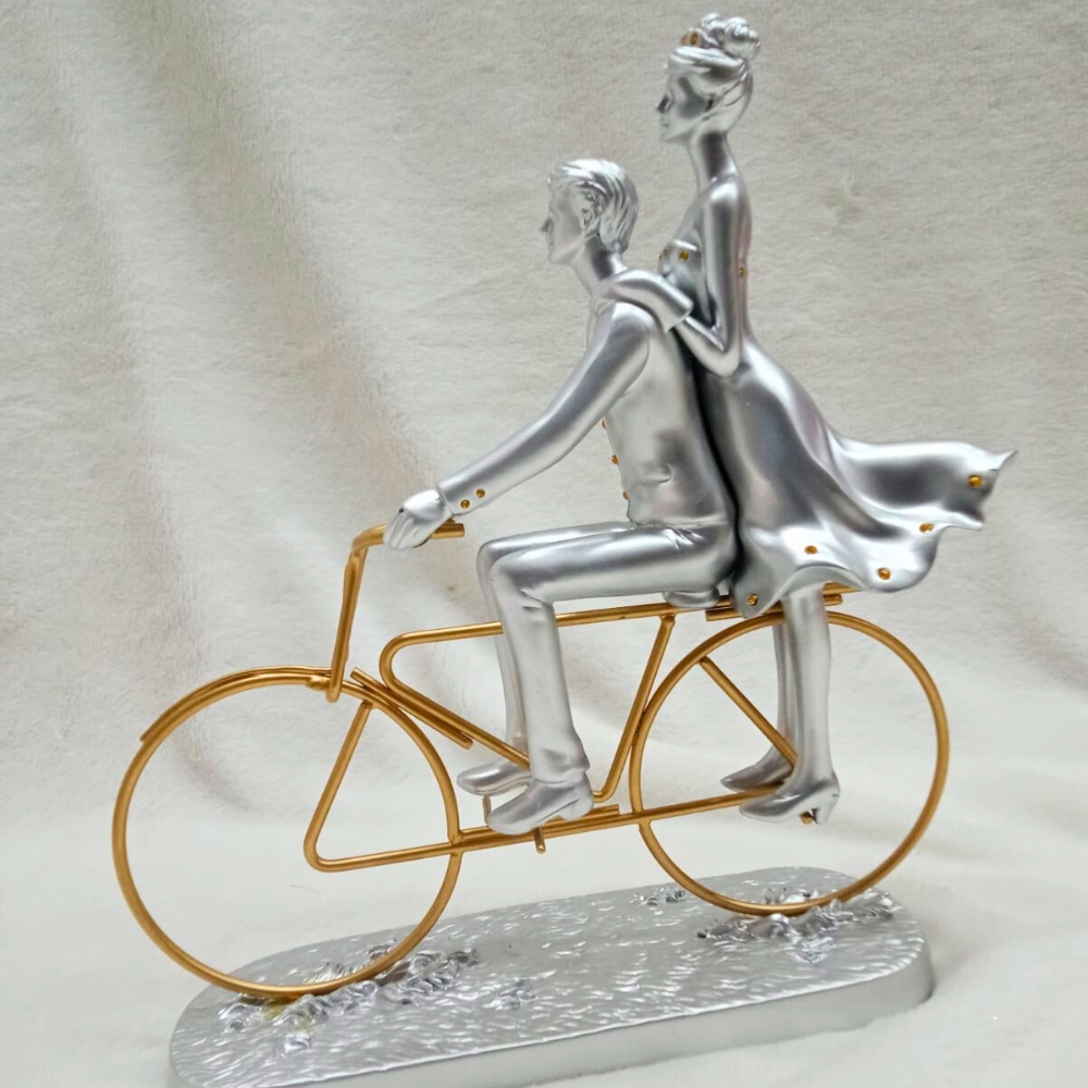 Elegant silver and gold bicycle couple sculpture, featuring a man and woman on a tandem bike. Ideal for home decor, weddings, or anniversaries. Durable and stylish design.