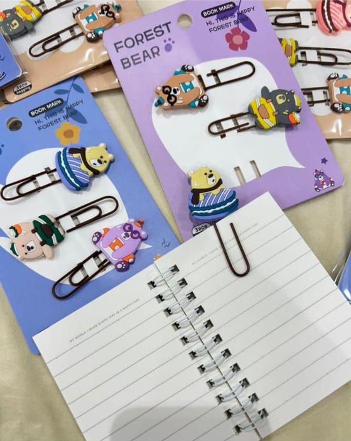 The clips are attached to cards labeled “FOREST BEAR” and described as “BOOK MARK – Hi, there! I’m happy – FOREST BEAR.”