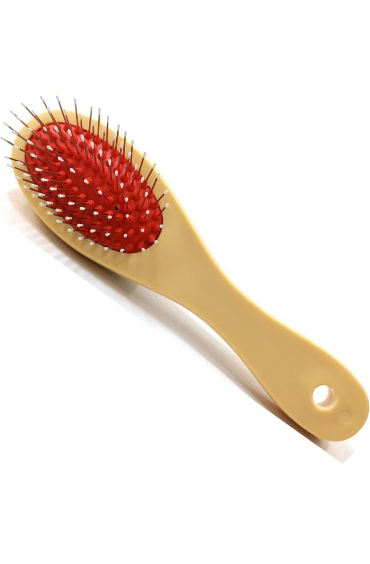 he image shows a hairbrush with a beige plastic handle and a red cushioned base holding the bristles