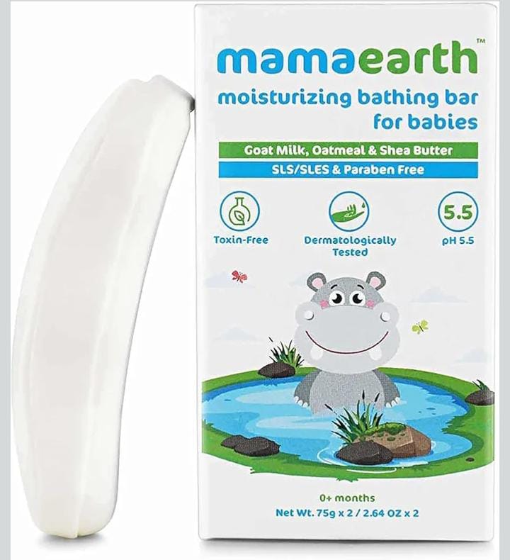 The image shows a package of Mamaearth Moisturizing Bathing Bar for Babies. Here’s a detailed description: