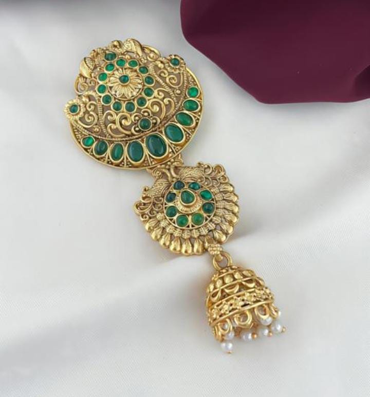 Features a crescent moon and floral spiral pattern, heavily embedded with green stones (emerald-like).