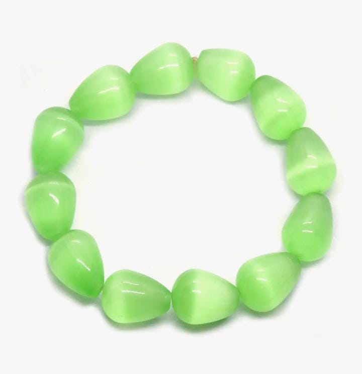 These beads are arranged on a stretch cord to form a circular bracelet.