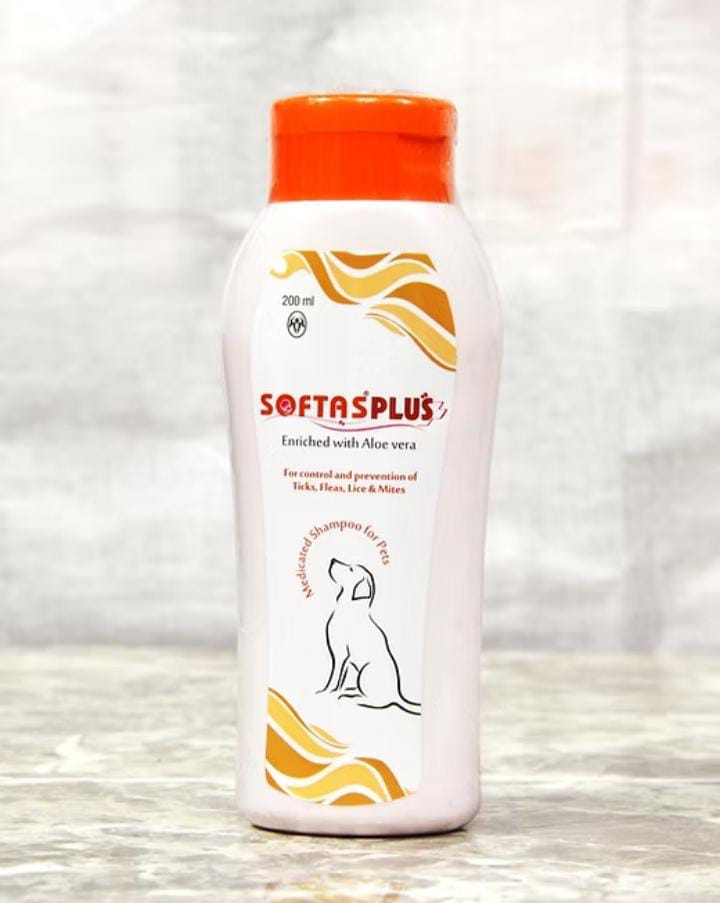 The image shows a bottle of SOFTAS PLUS medicated shampoo for pets.