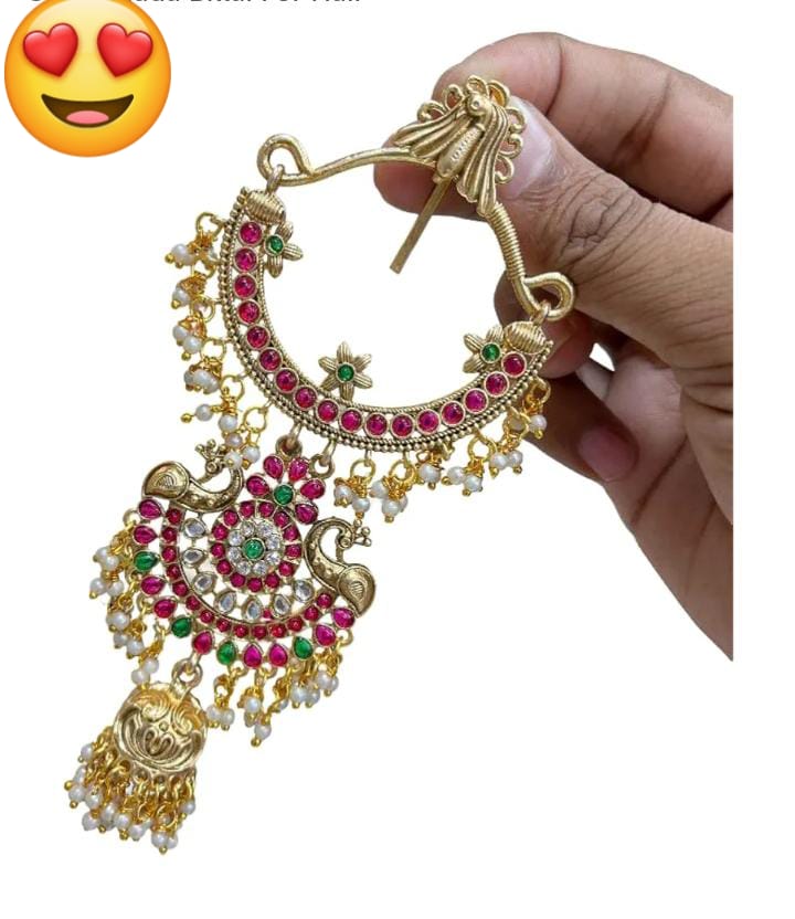 This is a traditional South Indian hair accessory, known as a  “Vanki-style Jadai Billai”, typically worn at the top of a bridal braid or as part of temple dance adornments.