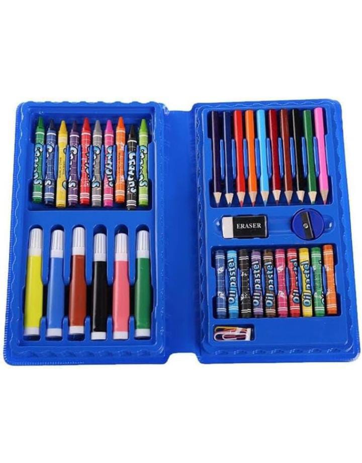 This image shows a comprehensive art and stationery kit housed in a blue plastic case, commonly used by children for drawing, coloring, and basic school activities.