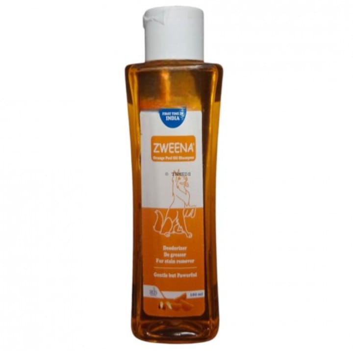 The image shows a bottle of ZWEENA® Orange Peel Oil Shampoo, a grooming product for pets.
